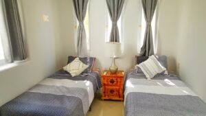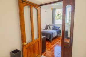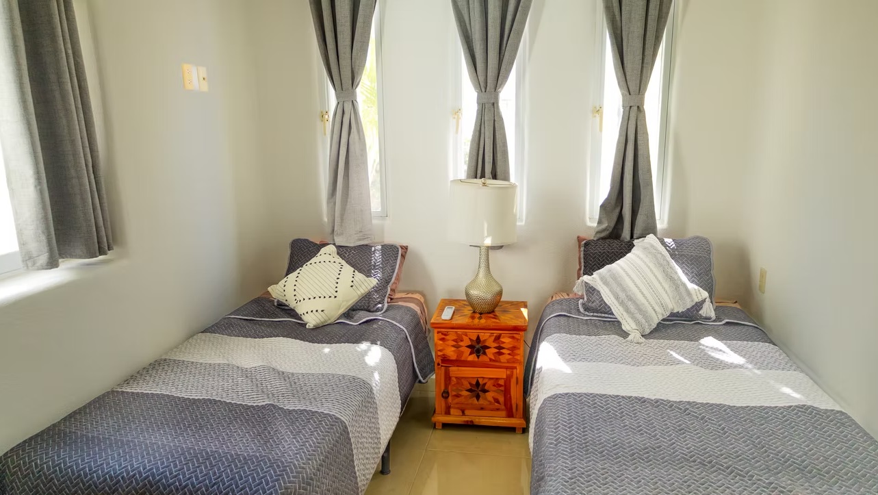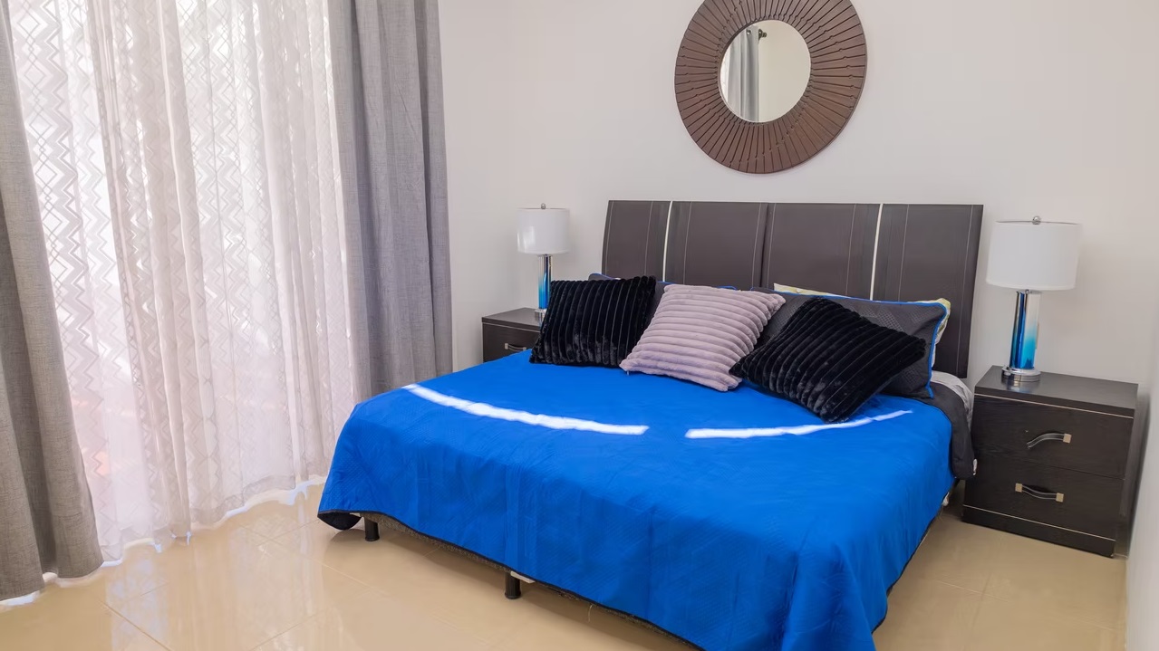 Esta residencia cuenta con tres dormitorios elegantemente decorados, dos de ellas con su propio baño completo y armarios empotrados. La suite principal ofrece un refugio sereno con acceso directo a la terraza, donde se puede disfrutar de las vistas al hermoso parque al frente de la propiedad.